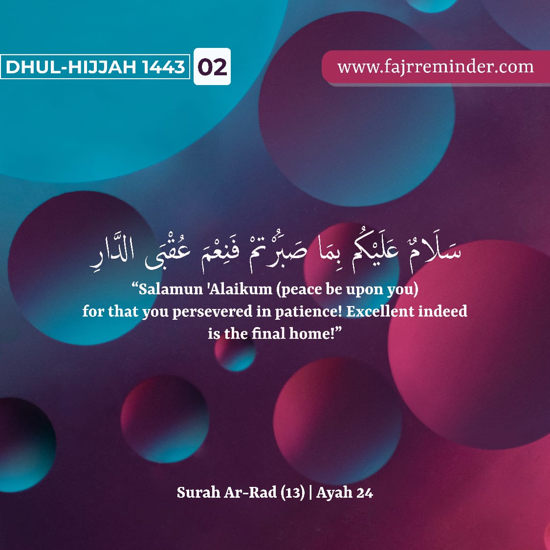 سَلَمٌ عَلَيْكُم بِمَا صَبَرْتُمْ فَنِعْمَ عُقْبَى الدَّارِ